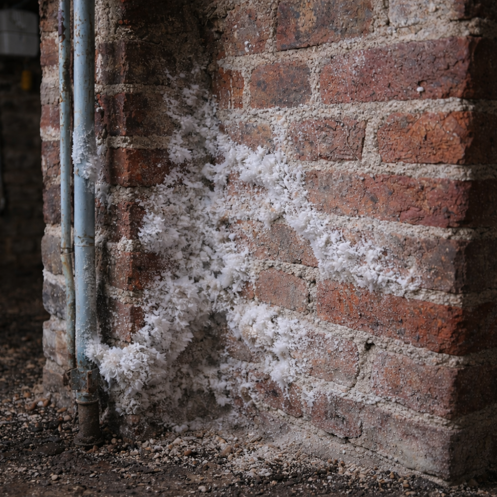 Le salpêtre correspond à la cristallisation de sels minéraux transportés par l’eau à travers des matériaux poreux tels que briques, mortiers ou enduits. Lorsque l’eau migre vers la surface puis s’évapore, les sels remontent et forment des dépôts blanchâtres caractéristiques. Cette cristallisation génère une pression interne dans les matériaux, provoquant leur effritement progressif. Le phénomène dépend directement de la présence d’humidité persistante dans les murs.